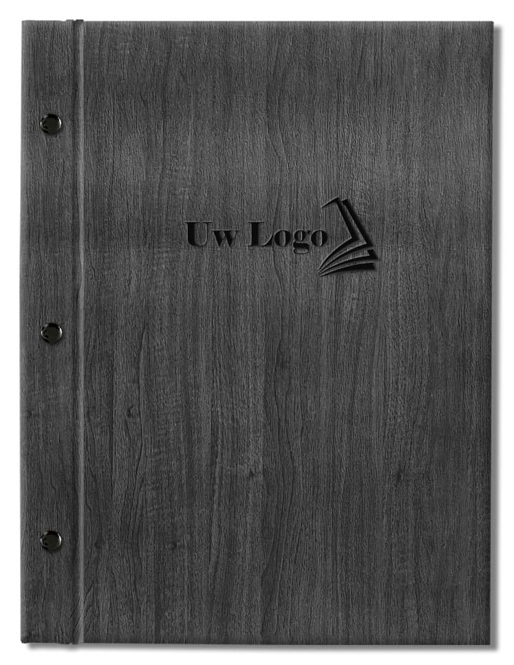 De door u gekozen menukaart is uitgerust met een schroefsysteem waarvan de schroeven zichtbaar zijn aan de buitenkant van de kaft. Dit zorgt voor een stoere, industriële uitstraling die direct in het oog springt. U kunt eenvoudig hoezen of passe-partouts bevestigen, wat het wisselen van menu’s snel en praktisch maakt. Onder deze tekst ziet u voorbeelden van beide opties.